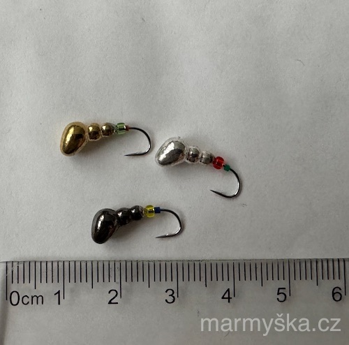 Kvalitní wolframová marmyška, hmotnost přibližně 1,6 gramu.