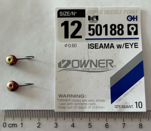 Ručně vyráběná marmyška na háčku značky Owner. Hmotnost přibližně 0,5g.